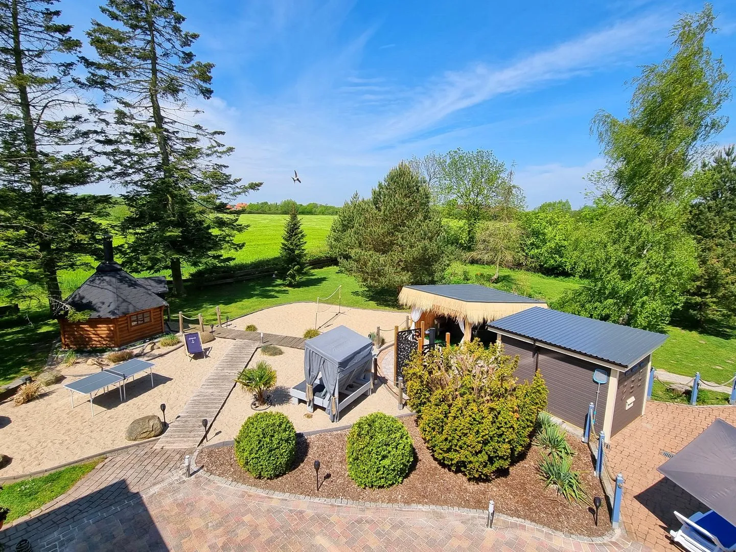 Garten & Freizeit: Rundpool je nach Wetterlage (saisonal Mai–September), Sauna mit Außendusche, Grillkota, Sandgärten, Sandplatz für Volleyball/Badminton, Tischtennisplatte