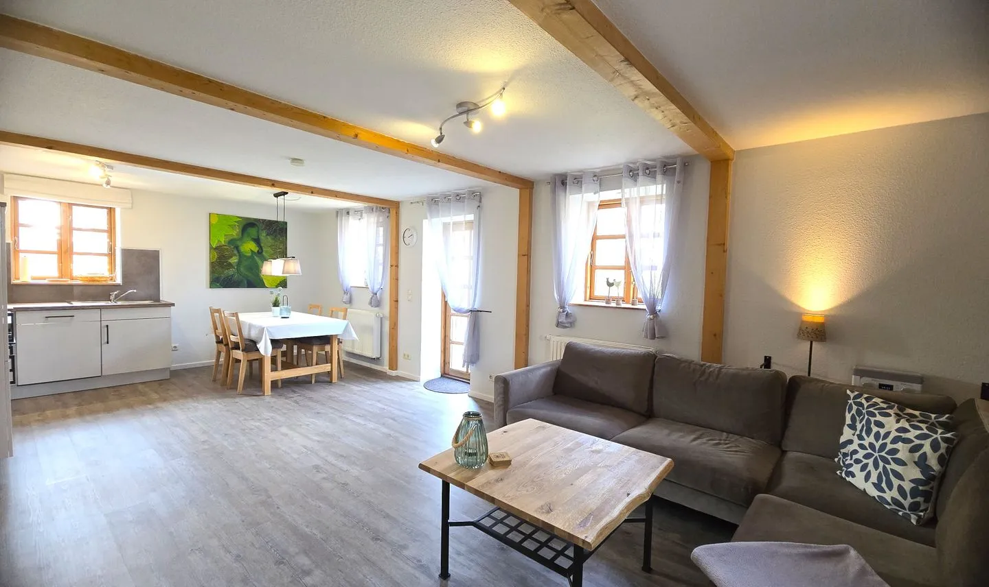 Sie verfügt über zwei gemütliche Schlafzimmer, einen großzügigen Wohn- und Essbereich, eine offene Küche sowie eine eigene Terrasse mit Grill. WLAN, ein Stellplatz und ein Fahrradunterstellplatz sind inklusive.